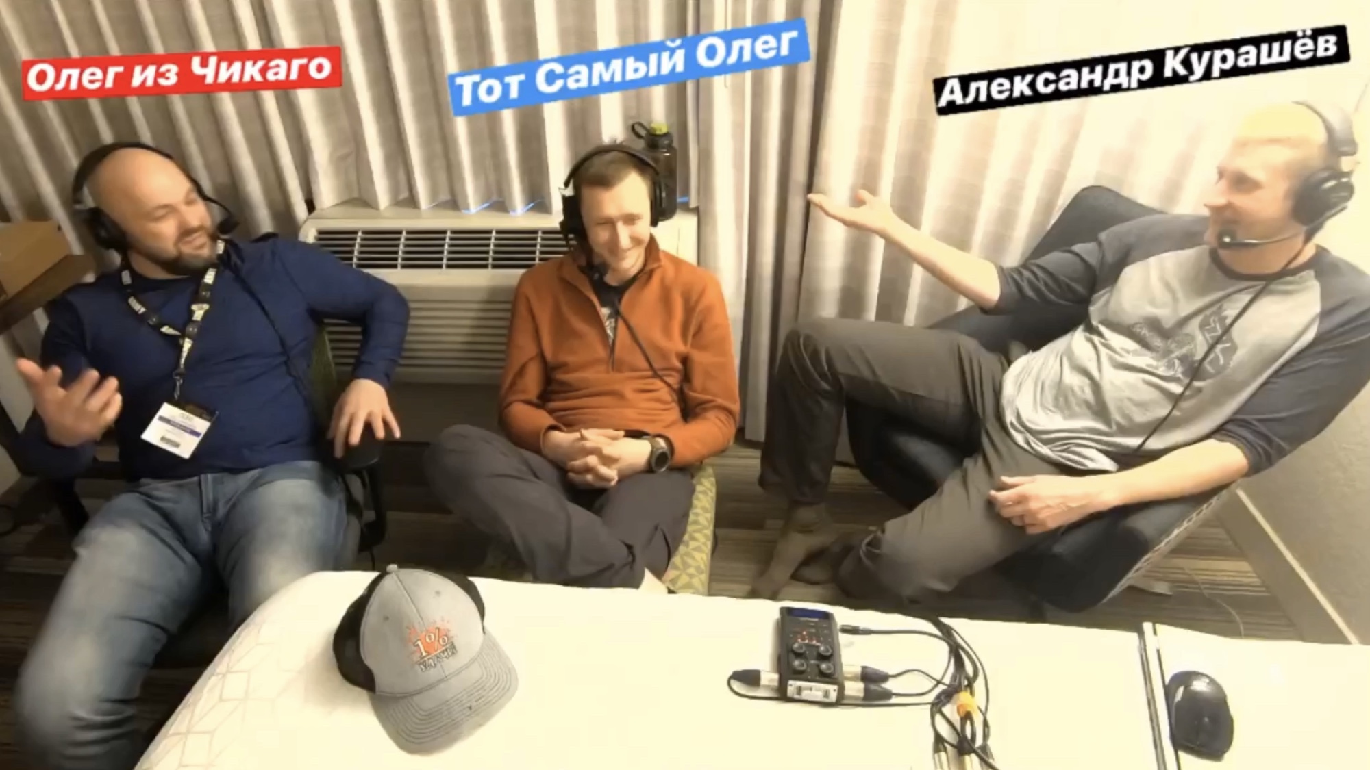 Прежде чем мы начнём делиться с вами своими впечатлениями от выставки, позвольте нам представиться. С вами по выставке будем гулять мы: Олег из Чикаго, Тот Самый Олег и я, ведущий подкаста 1% Удачи, Александр Курашёв. В этом эпизоде мы расскажем немного о себе.