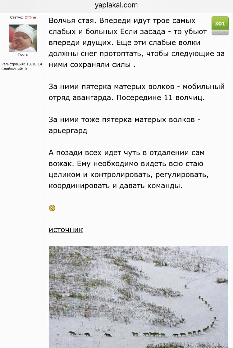 Уверен, что многие из вас уже видели это ставшее популярным фото и читали описание к нему. Там речь идёт об организации волчьей стаи в процессе передвижения по глубоком снегу якобы во время охоты на бизонов (см. фото). Это фото не перестают постить и репостить… Continue Reading «Волчья стая, шарлатаны и критическое мышление.»